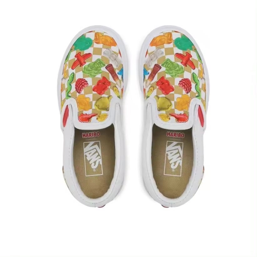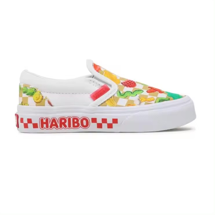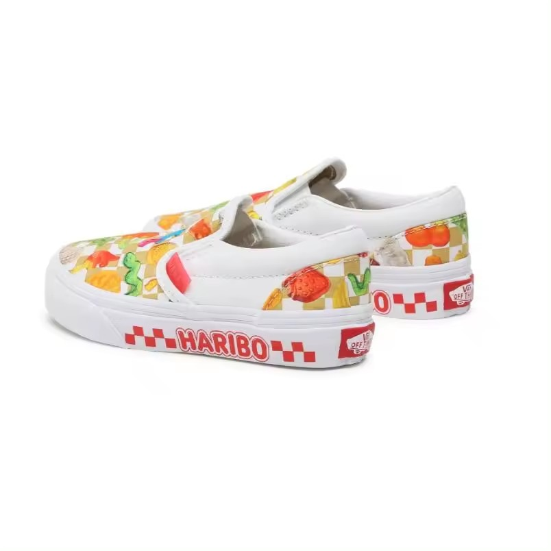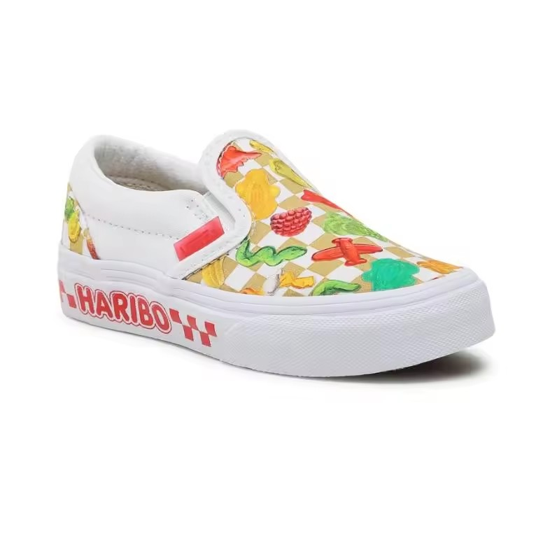 Vans y Haribo se unen para una colección de calzado que celebra la felicidad infantil de los gominolas más populares del mundo. Con las inconfundibles gominolas de Haribo por todas partes, las Vans x Haribo Kids Classic Slip-On rinde homenaje a ambas marcas al brindar una alegría irresistible en cada paso, sin importar tu edad, sin importar la ocasión. La marca Haribo en la pared lateral completa el aspecto lúdico de este icónico zapato sin cordones. Parte superior textil de perfil bajo. Gominolas por todas partes. Marca Haribo en las paredes laterales. Cuello acolchado de apoyo. Detalles laterales elásticos. Suelas waffle de goma distintivas.
